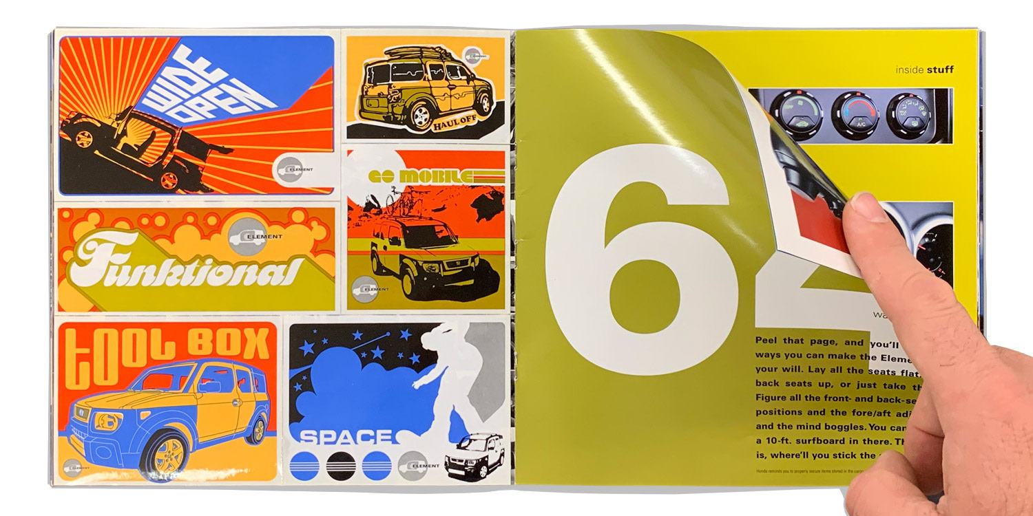For the Honda Element sales catalog, we created a special centerfold sticker sheet. The illustrations and copy creatively showcased the unique features of the new models.