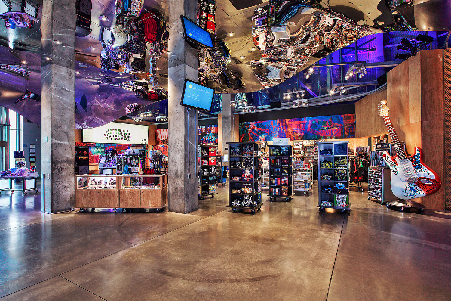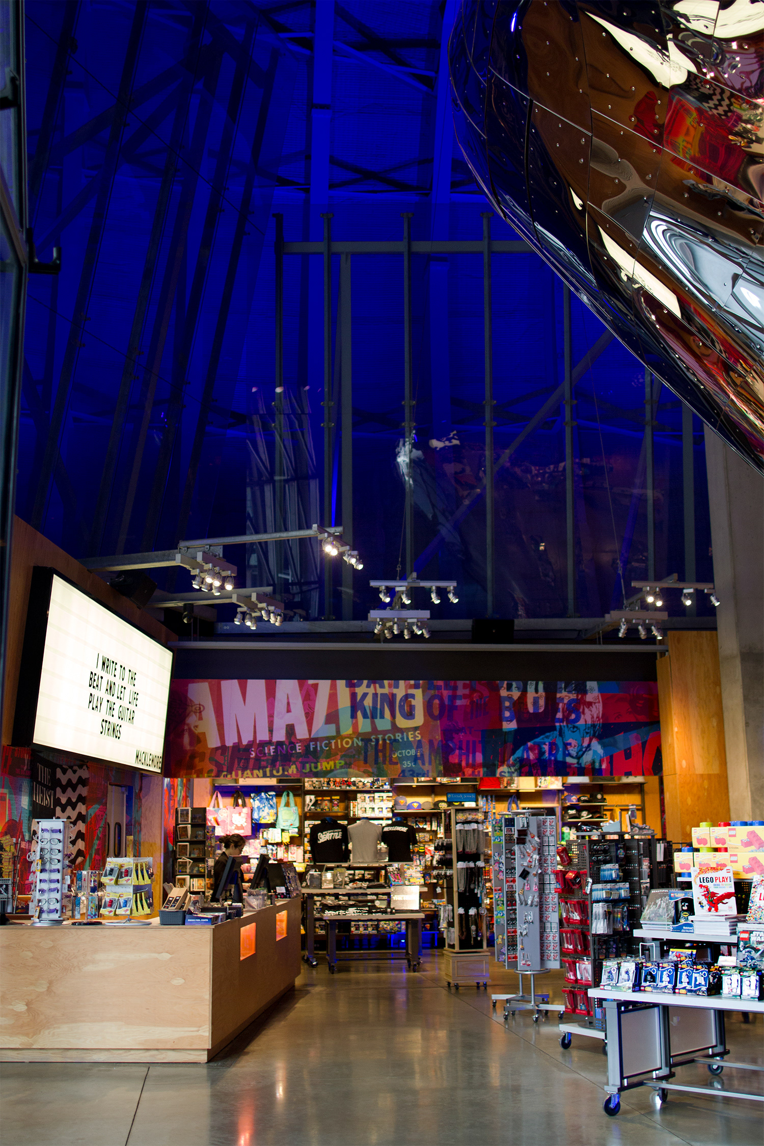We’ve been working with MoPOP since it was just a notion. Coby created promo materials for Paul Allen’s Experience Music Project (later renamed EMP), years before the museum opened their doors. When they approached us for a complete reboot of their museum store, we were all in. Creating unique murals, signage, a giant marquee, custom cash wrap and fixtures, all complimenting Frank Gehry’s amazing space.
