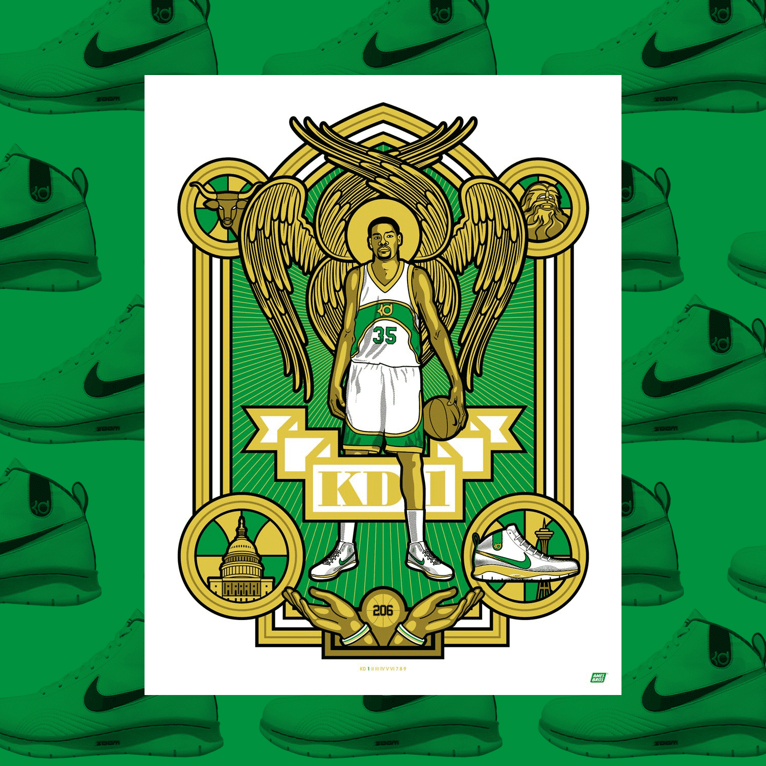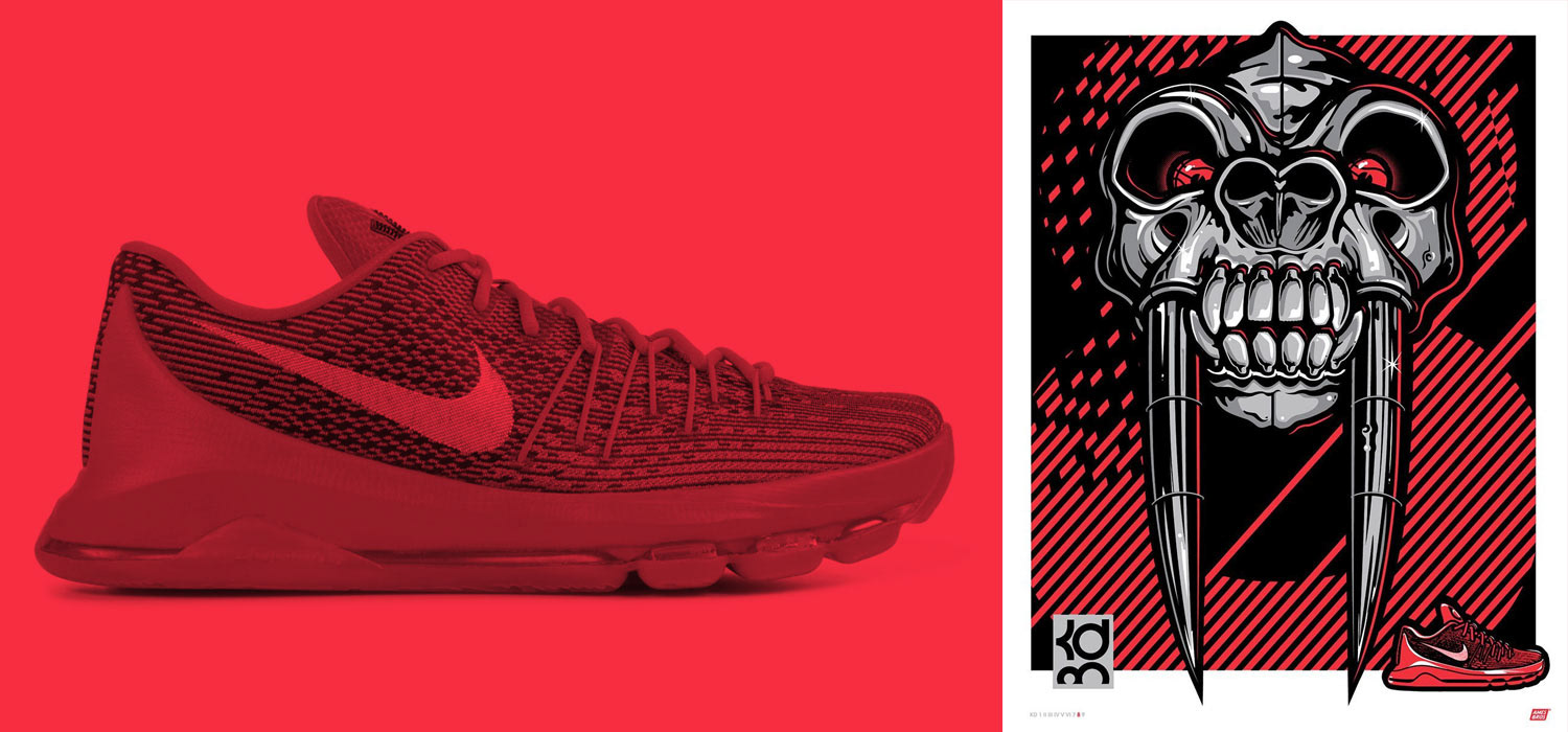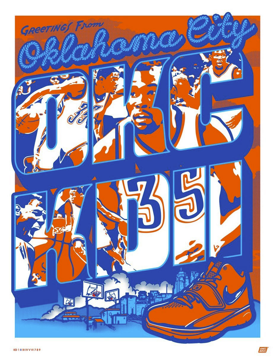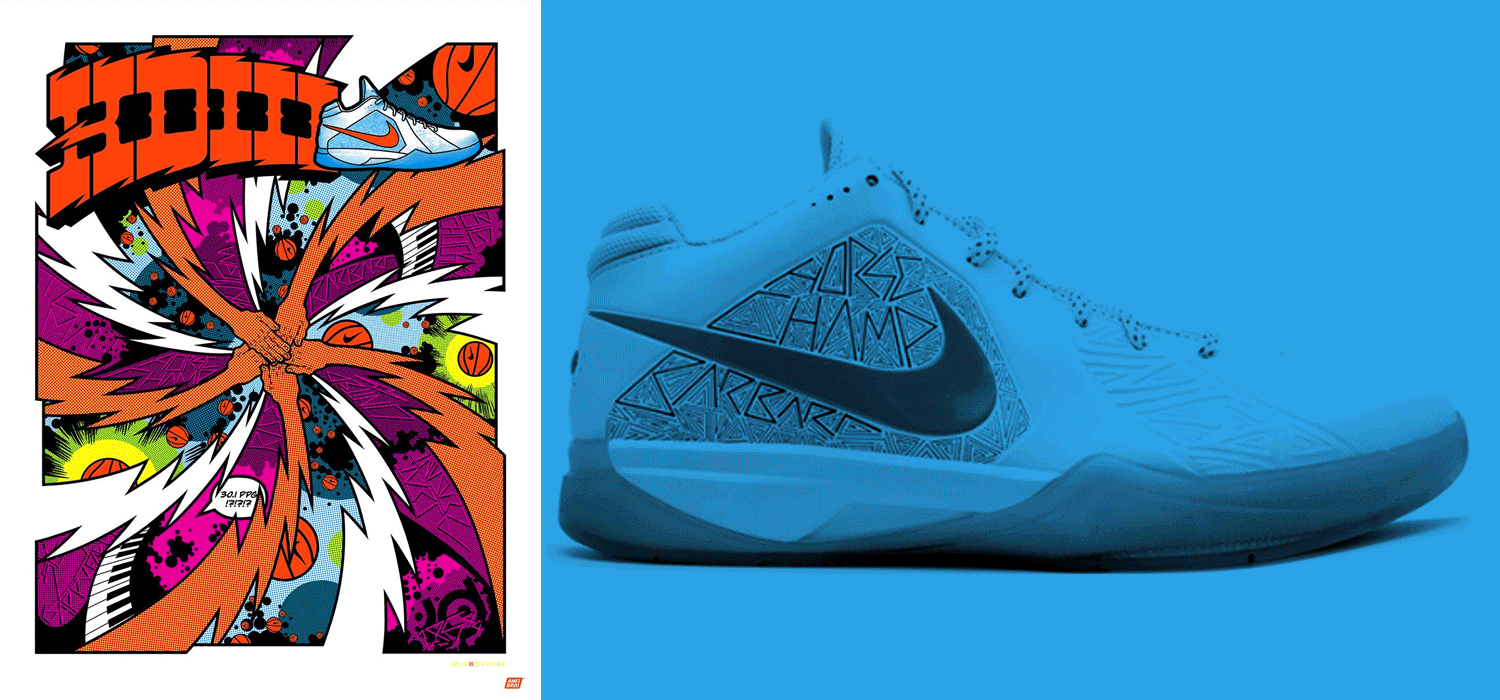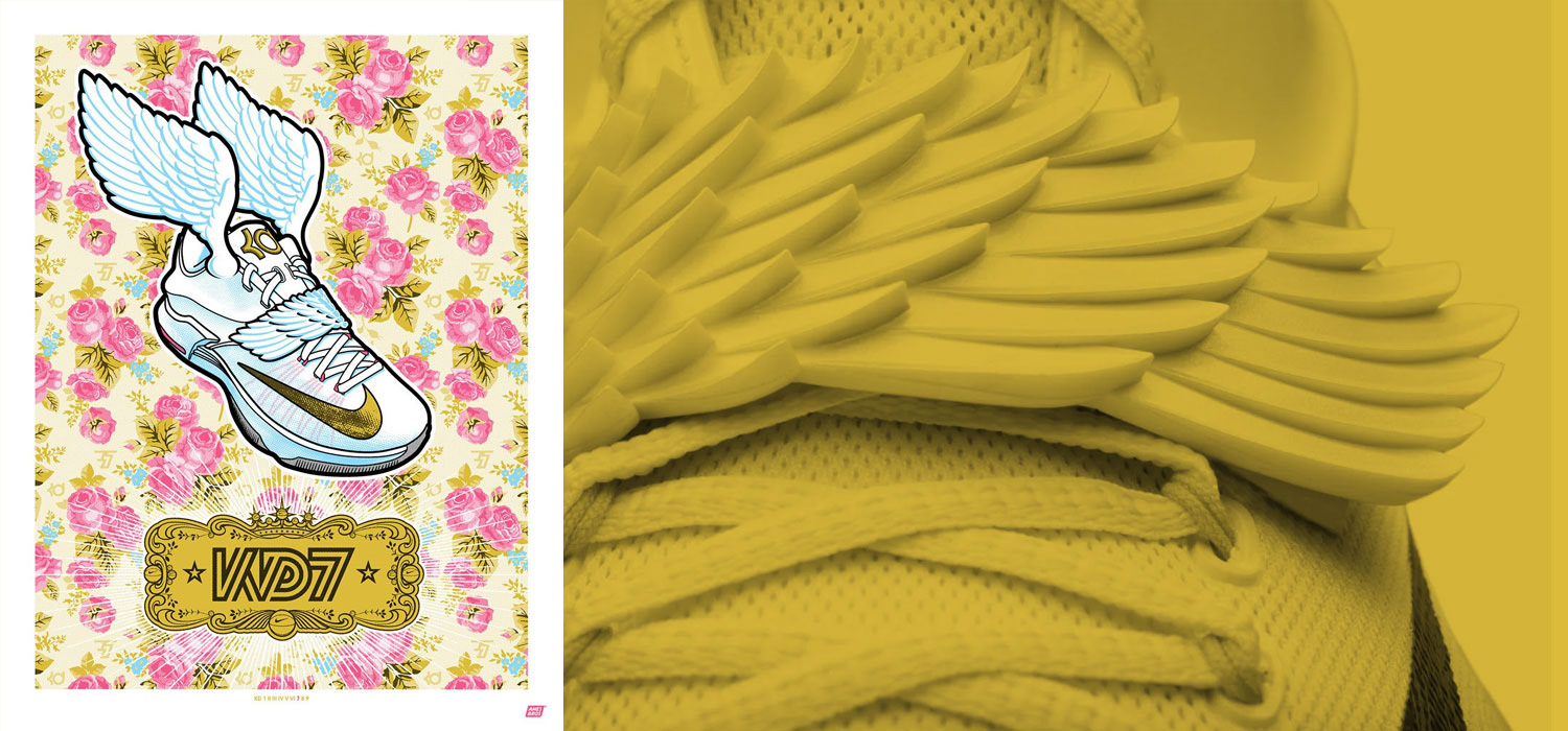 When it was time to launch NBA Superstar, Kevin Durant’s new Nike KD9 shoes at the USA Premiere in NYC, Ames Bros was summoned to create a series of 9 limited edition prints, each featuring a unique KD shoe (KDI- KD9), highlighting the inspiration behind each shoe and spotlighting Durant’s colorful history and NBA career.